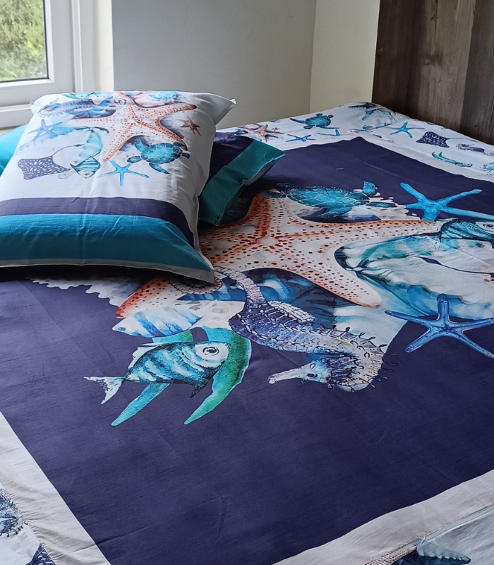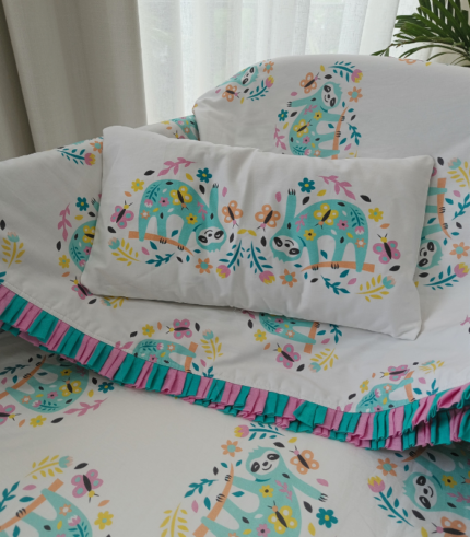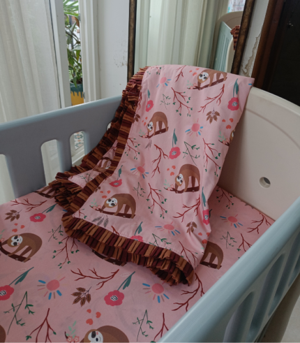 Sloth Bear print crib sheet & comforter in melon pink floral base. Made with premium cotton poplin and soft cambric stripes back, decorated with frills. Versatile as crib sheet, stroller sheet, bed sheet, or swaddle. Cosy, comfortable, and attractive for your baby’s nursery.