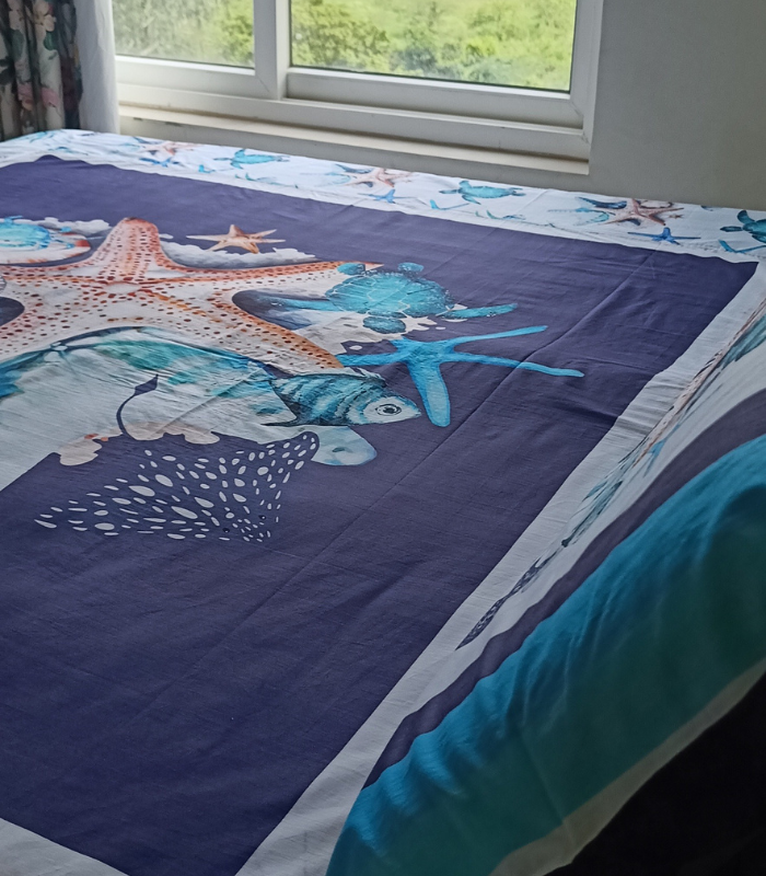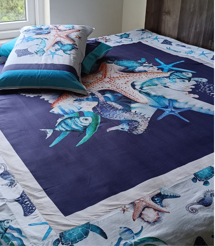 Premium Sea Life Digital Print King Size Cotton Poplin Bed Sheet with pillow covers. Premium handmade stitching, perfect for sea theme bedrooms & resorts.
