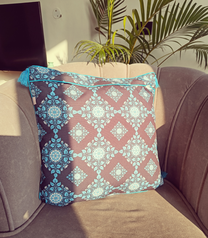The subtle yet bold combination of soothing sky blue and deep charcoal hues creates a visually appealing contrast that complements a variety of interior styles. The intricate digital print enhances the overall aesthetic, making this cushion cover a statement piece in your home.